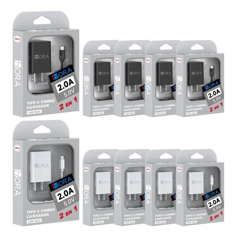 Paquete de 10 piezas Combo Cargador Tipo C Marca: 1Hora ESPECIFICACIONES TÉCNICAS DEL PRODUCTO: • Conector de entrada: Clavija • Entrada: CA 100-240V – 50/60Hz 0.4A • Salida: CC 5V – 2.0A 10W • Interfaz: Una salida de USB • Material: Aluminio y acero • Medida: 61x35x22 mm